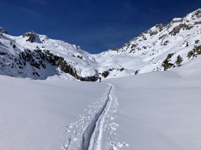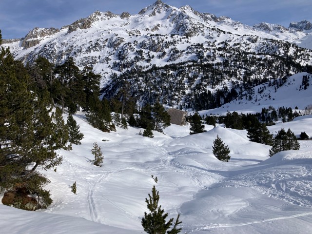 Départ matinal depuis le Pont d’Espagne, skis aux pieds, dans la superbe vallée du Marcadau encore calme sous la neige. Le groupe progresse tranquillement sur la large vallée avant de bifurquer vers les lacs de l’Embarrat, où le paysage devient plus minéral et sauvage.