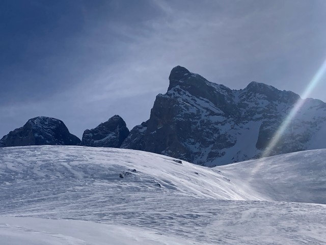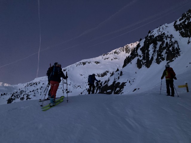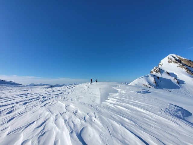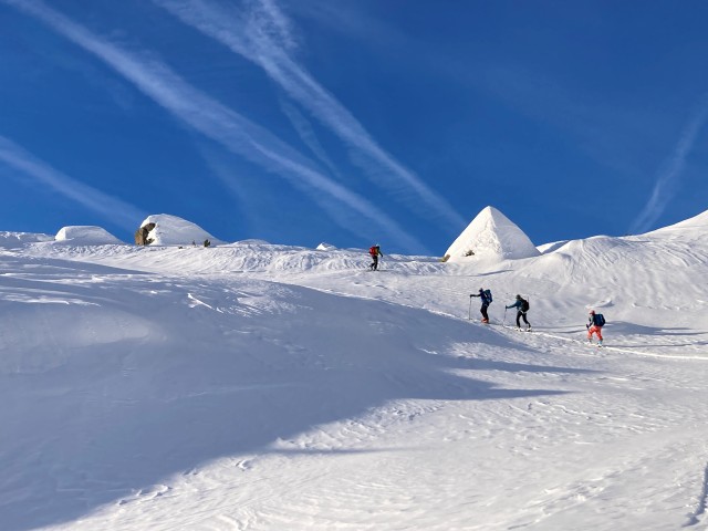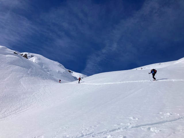 La neige est dure. Dès les premiers mètres, les couteaux sont de sortie pour une longue traversée qui nous met immédiatement dans le ton de la journée. Les pentes se redressent progressivement.