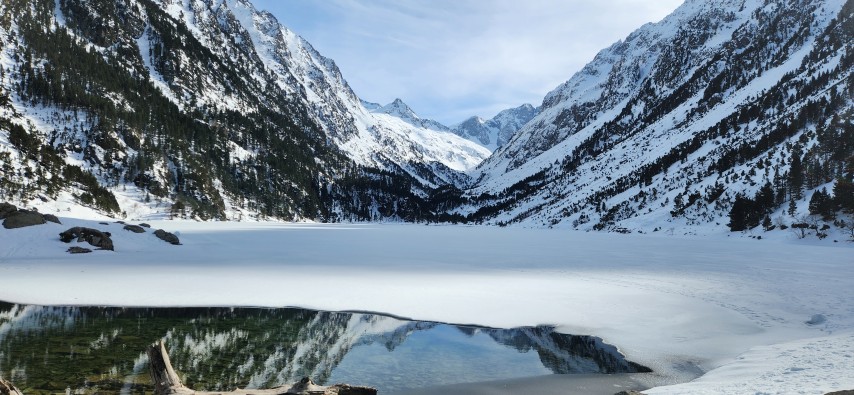 Après cette première montée, l’itinéraire remonte le ruisseau du Pourtet jusqu’au lac du Pourtet, entouré de sommets enneigés. L’ambiance devient plus alpine à l’approche du col de Bassia, franchi dans un décor splendide.