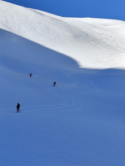 Les descentes s’enchaînent dans une neige encore excellente mais les cuisses et les ampoules commencent à rappeler que quatre jours de raid laissent des traces.