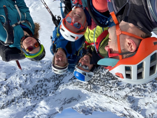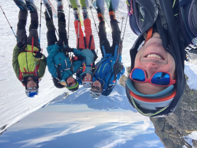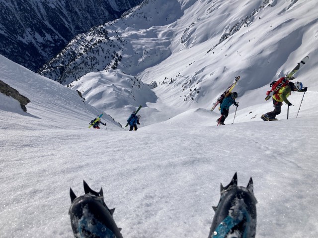 Les gestes deviennent plus précis, plus techniques. C’est le moment de mettre en pratique les exercices de la veille. Nous façonnons une petite plateforme dans la pente pour passer en mode alpinisme : crampons aux pieds, piolet en main. Arnaud, notre petit isard, nous mitraille avec son téléphone. Les photos promettent déjà de beaux souvenirs… et quelques airs d’alpinistes aguerris. On est loin du simple ski touring !