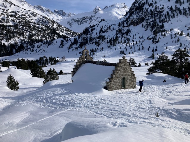 Après avoir rechaussé les skis, nous atteignons le collado de Pondellios (2812m). Le décor est splendide. On en profite pour faire et une pause et admirer le couloir : Fred évalue la difficulté et la fatigue commence à se faire sentir après cette ascension déjà bien technique. Finalement, nous décidons de ne pas le tenter. Nous reprenons des forces en déjeunant et en admirant le somptueux décor.