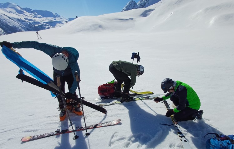 Après avoir retiré les crampons et chaussé les skis, nous dégustons notre première descente sur une