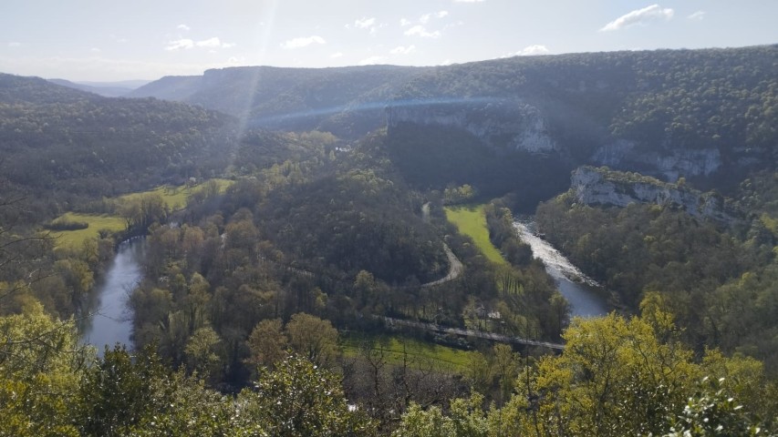Petit pique-nique convivial avec vue sur les gorges de l'Aveyron, et on reprend notre périple. Après une recherche vaine de grottes bien cachées, dans un joli décor de bois moussus, on continue sur une belle piste qui descend monte, tourne à droite, à gauche, redescend, …et nous ramène au point de départ, la boucle est bouclée.
