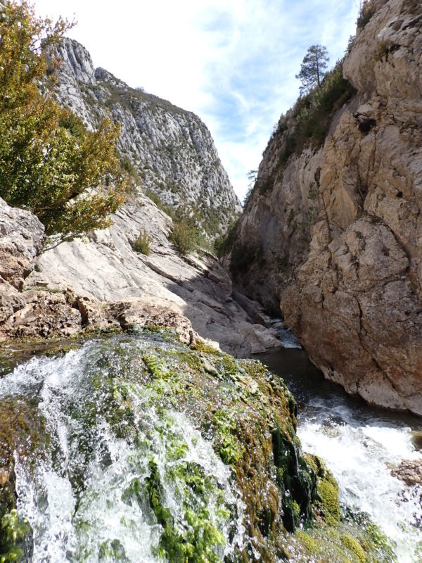 Départ 9h de l'appartement pour le combo. Sur la marche d'approche nous distinguons difficilement l'eau couler sur la dernière cascade de Teixidor. Approche par le pont très lisible.