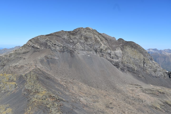 La vue au sommet est splendide sur le Massif du Mont Perdu. On y voit les 3 Sœurs, la Punta Olas 3022m, le Soum de Ramon 3329m, le Mont Perdu 3355m, le Cylindre 3328m ainsi que sur les lacs de la Munia, la Pena Blanca 2826m, la Munia 3133m puis le Vignemale 3298m un peu plus loin. La vue sur la vallée de Barrosa est superbe. Ce qui est étrange, c’’est que des chèvres étaient quasiment au sommet alors qu’il n’y a que des cailloux et pas un brin d’herbe.