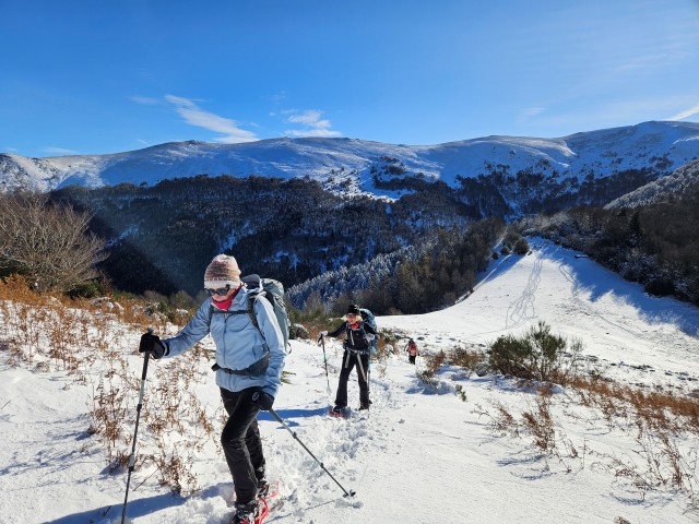 Tout a commencé à Foix, où nous avons débuté un jeu de piste pour retrouver Albane sur le parking des Moulins mais après quelques détours, nous nous sommes enfin retrouvés. S’en est suivi l’épisode du chaînage avec nos experts en la matière Jean Luc, Pascal et Gilles pour enfin arriver au col de Legrillou. Un décor à avoir presque envie d’arriver en traîneau sur ce joli manteau, « tellement qu’c’était beau ».