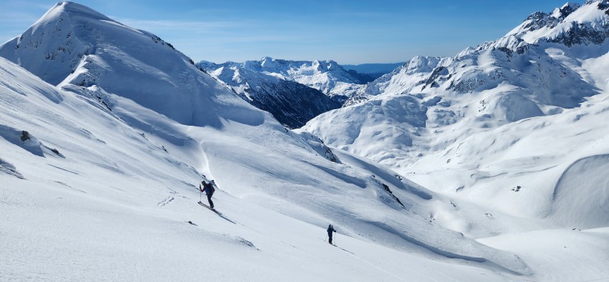 La neige est dure. Dès les premiers mètres, les couteaux sont de sortie pour une longue traversée qui nous met immédiatement dans le ton de la journée. Les pentes se redressent progressivement.