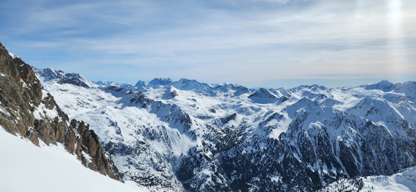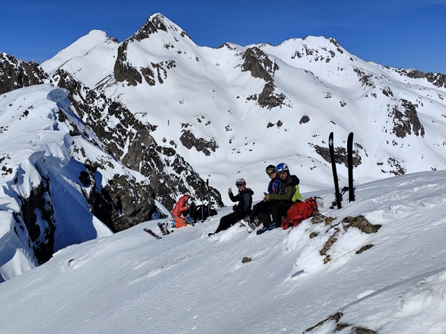Après avoir rechaussé les skis, nous atteignons le collado de Pondellios (2812m). Le décor est splendide. On en profite pour faire et une pause et admirer le couloir : Fred évalue la difficulté et la fatigue commence à se faire sentir après cette ascension déjà bien technique. Finalement, nous décidons de ne pas le tenter. Nous reprenons des forces en déjeunant et en admirant le somptueux décor.