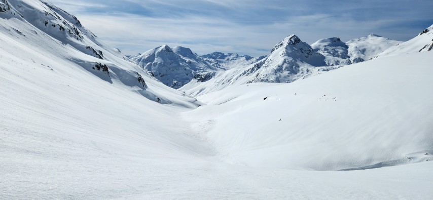 Après cette première montée, l’itinéraire remonte le ruisseau du Pourtet jusqu’au lac du Pourtet, entouré de sommets enneigés. L’ambiance devient plus alpine à l’approche du col de Bassia, franchi dans un décor splendide.