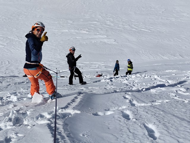 Une journée courte : 9kms et seulement 880m de dénivelé mais cette arrivée tôt au refuge nous permet de réviser (ou apprendre parfois) les techniques de cordes, de cramponnages etc. et on pourra vérifier dès le lendemain que cette après midi technique aura été très très utile !!! Merci Fred super idée cet atelier pratique !!!