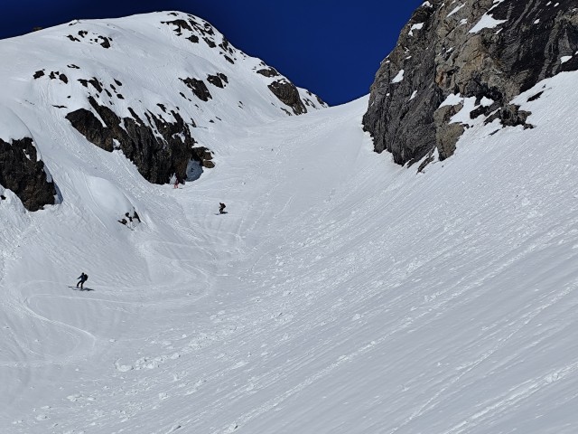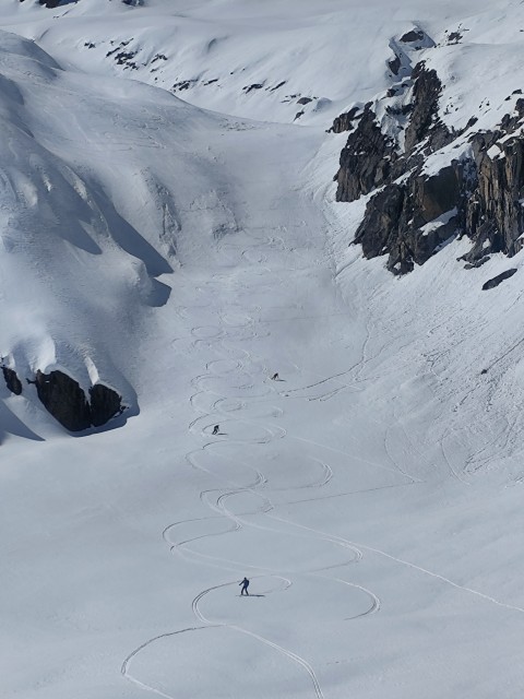 une super bonne descente dans de la neige parfaite dans un couloir vers la Cabaña del Pastor,