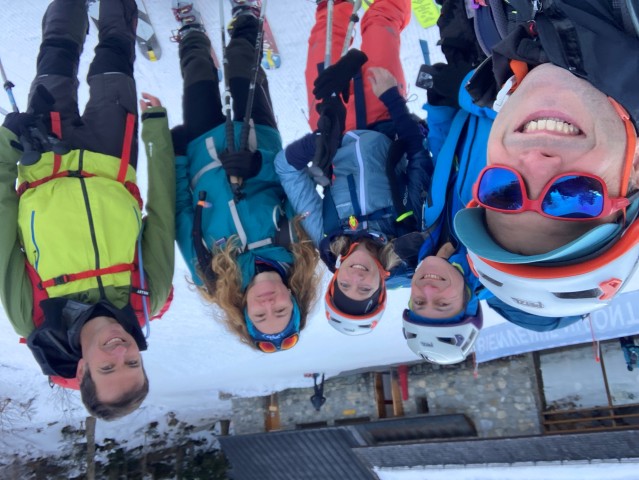 Les gestes deviennent plus précis, plus techniques. C’est le moment de mettre en pratique les exercices de la veille. Nous façonnons une petite plateforme dans la pente pour passer en mode alpinisme : crampons aux pieds, piolet en main. Arnaud, notre petit isard, nous mitraille avec son téléphone. Les photos promettent déjà de beaux souvenirs… et quelques airs d’alpinistes aguerris. On est loin du simple ski touring !