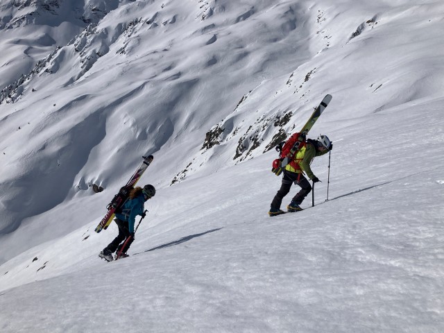 La descente peut alors commencer. Entre passages skiés et transitions, les peaux font plusieurs allers-retours entre les skis et le sac.