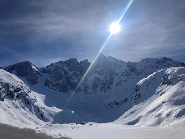 Départ matinal depuis le Pont d’Espagne, skis aux pieds, dans la superbe vallée du Marcadau encore calme sous la neige. Le groupe progresse tranquillement sur la large vallée avant de bifurquer vers les lacs de l’Embarrat, où le paysage devient plus minéral et sauvage.