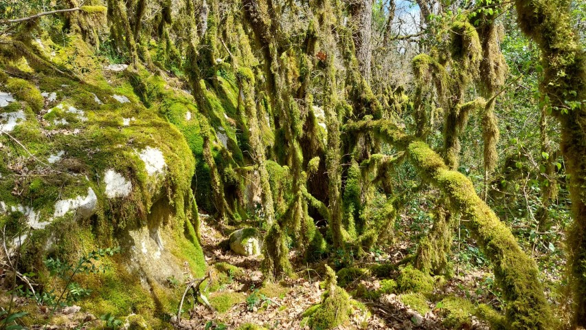 Petit pique-nique convivial avec vue sur les gorges de l'Aveyron, et on reprend notre périple. Après une recherche vaine de grottes bien cachées, dans un joli décor de bois moussus, on continue sur une belle piste qui descend monte, tourne à droite, à gauche, redescend, …et nous ramène au point de départ, la boucle est bouclée.