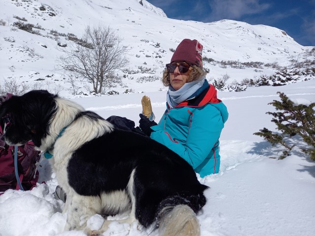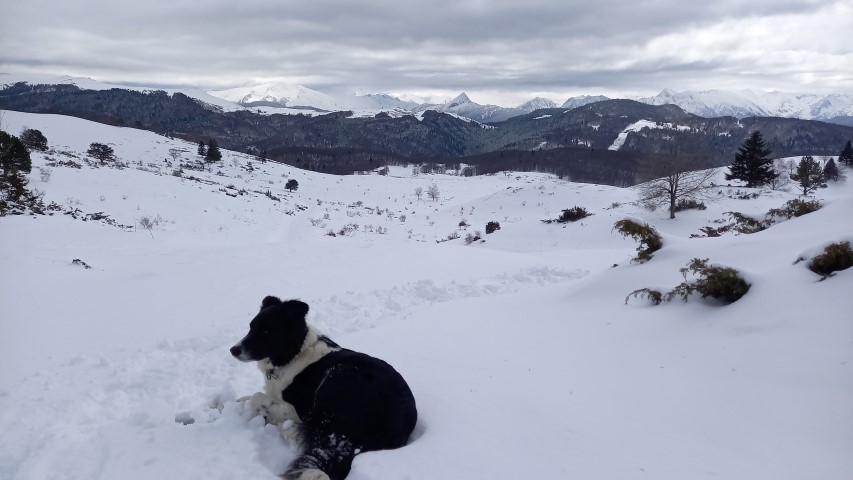 Un 7eme participant s’est invité depuis ce matin, un sympathique border collie, il fera la trace tout du long et se prendra d’affection pour Elisabeth au moment du déjeuner…