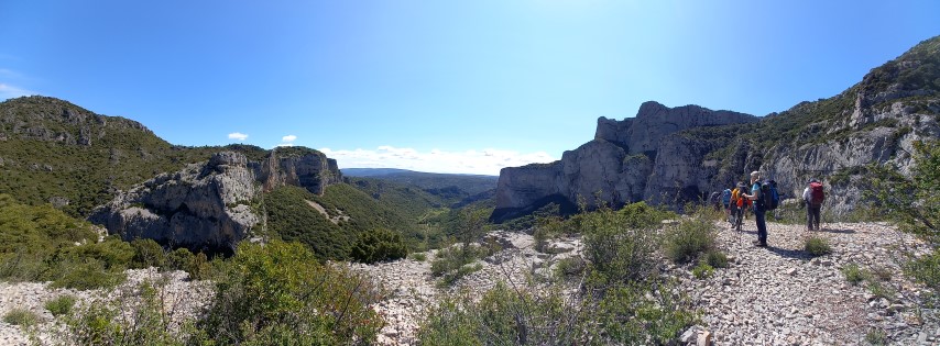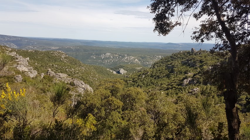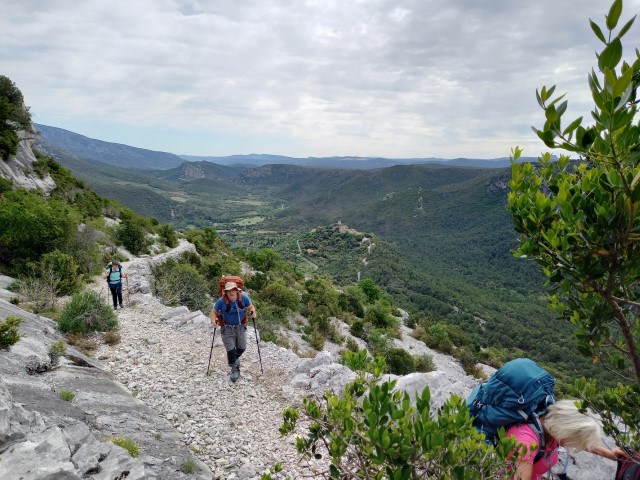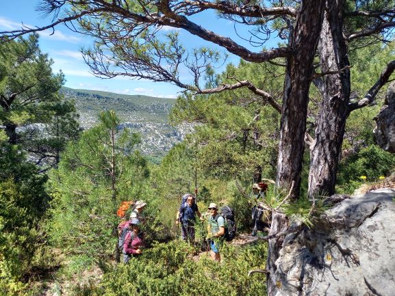 Après la pause déjeuner, le chemin se perd dans la garrigue et nous entamons une longue descente éprouvante et jonchée de pyrales…