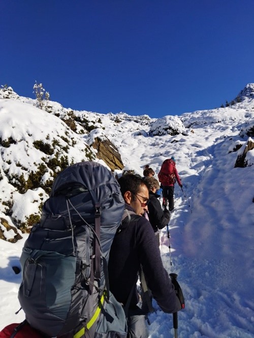 Répartition des taches : certains vont chercher du bois, d'autres de l'eau. Gilles, grand courageux, monte néanmoins sa tente dans la neige, les 5 autres préférant la relative tiédeur de la cabane... L'apéritif partagé (et arrosé) réchauffe les corps et les cœurs autour de la cheminée ! 20h30 chacun regagne son couchage sous de multiples couches de Mérinos, polaires et doudounes, pour une nuit plus paisible pour certains que pour d'autres.