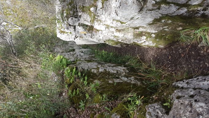La descente par la Combe de Lioux ne présente pas de difficulté, bien plus forestière et est agrémentée par quelques passages dans la roche un peu plus étroite, mais surtout par une petite grotte et deux vastes abris sous roche. Dénivelé = 450 m, Distance = 14,5 km