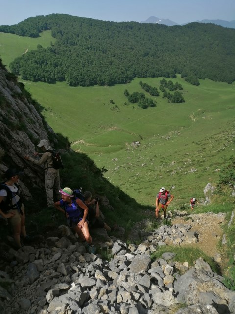 Nous profitons de ce superbe panorama pour repérer les sommets environnants sur la carte, et après quelques photos, nous descendons légèrement pour déjeuner à l’ombre de quelques hêtres accueillants. Notre repas est animé par un groupe de chèvres curieuses qui décident néanmoins de nous laisser tranquille pour une sieste appréciable.
